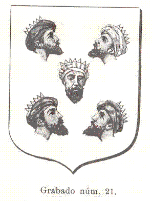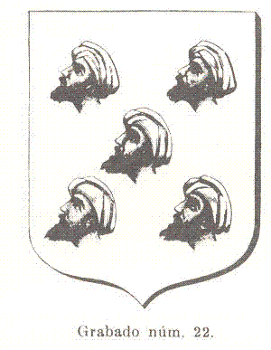 Sería muy de desear el que se hallara algún dato que diera fuerza a esa tradición y nos mostrara o describiera el escudo tal y como fue en su principio, pero mientras eso no se logre, creemos que la única composición racional que aquél debe tener es la que los principios heráldicos nos enseñan: esto es, las cinco cabezas de sable, con turbantes blancos, y puestas de perfil mirando al lado derecho del escudo. El grabado número 22, composición nuestra, lo representa de ese modo”.